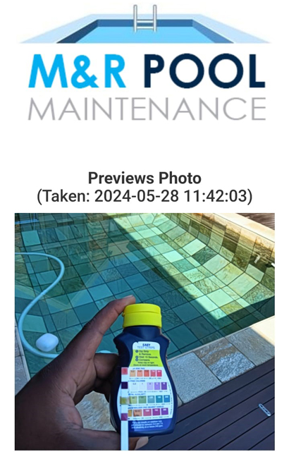 At M & R Pool Maintenance we do things very differently. We have a custom built online platform to which we upload pics of each pool as an when we do the maintenance not only to confirm that we were in fact there on a specific day but also what time and what the ph reading was on that day. We can then go back many weeks to see what the trend is and if/when a problem occurred. This way we get to know each pool individually since no 2 pools are the same. The owner of the company then logs in daily to view each pool via this online platform.